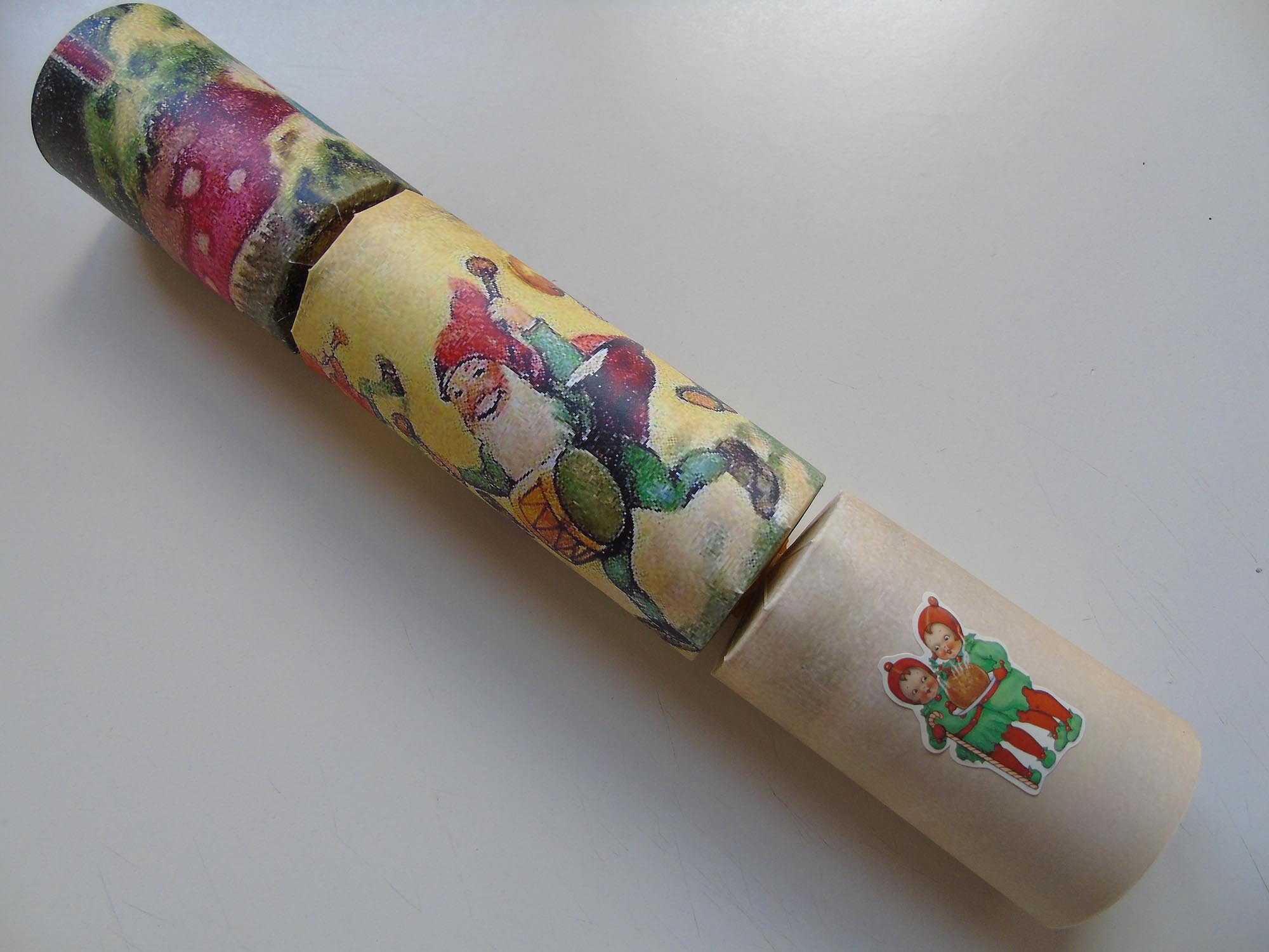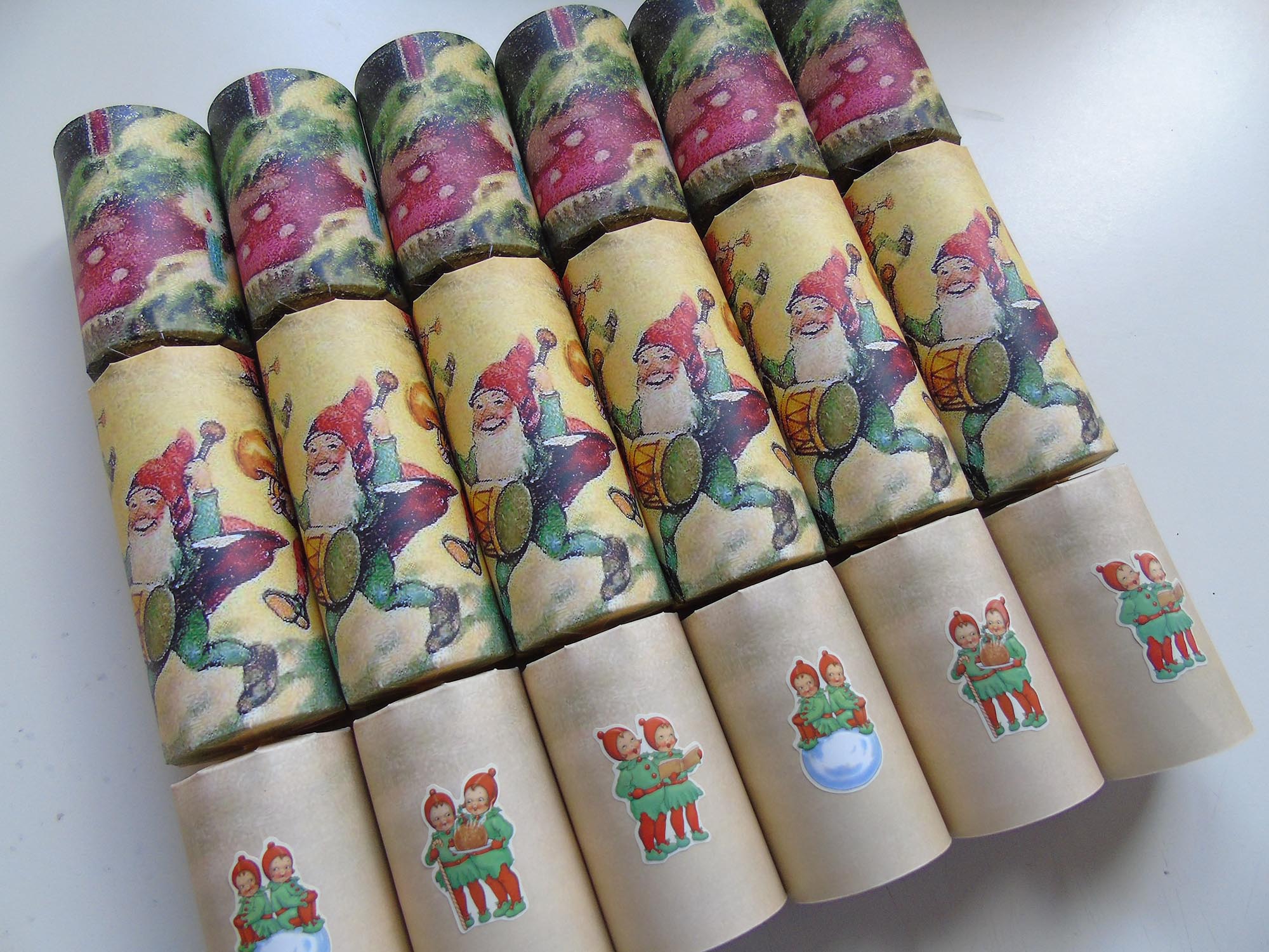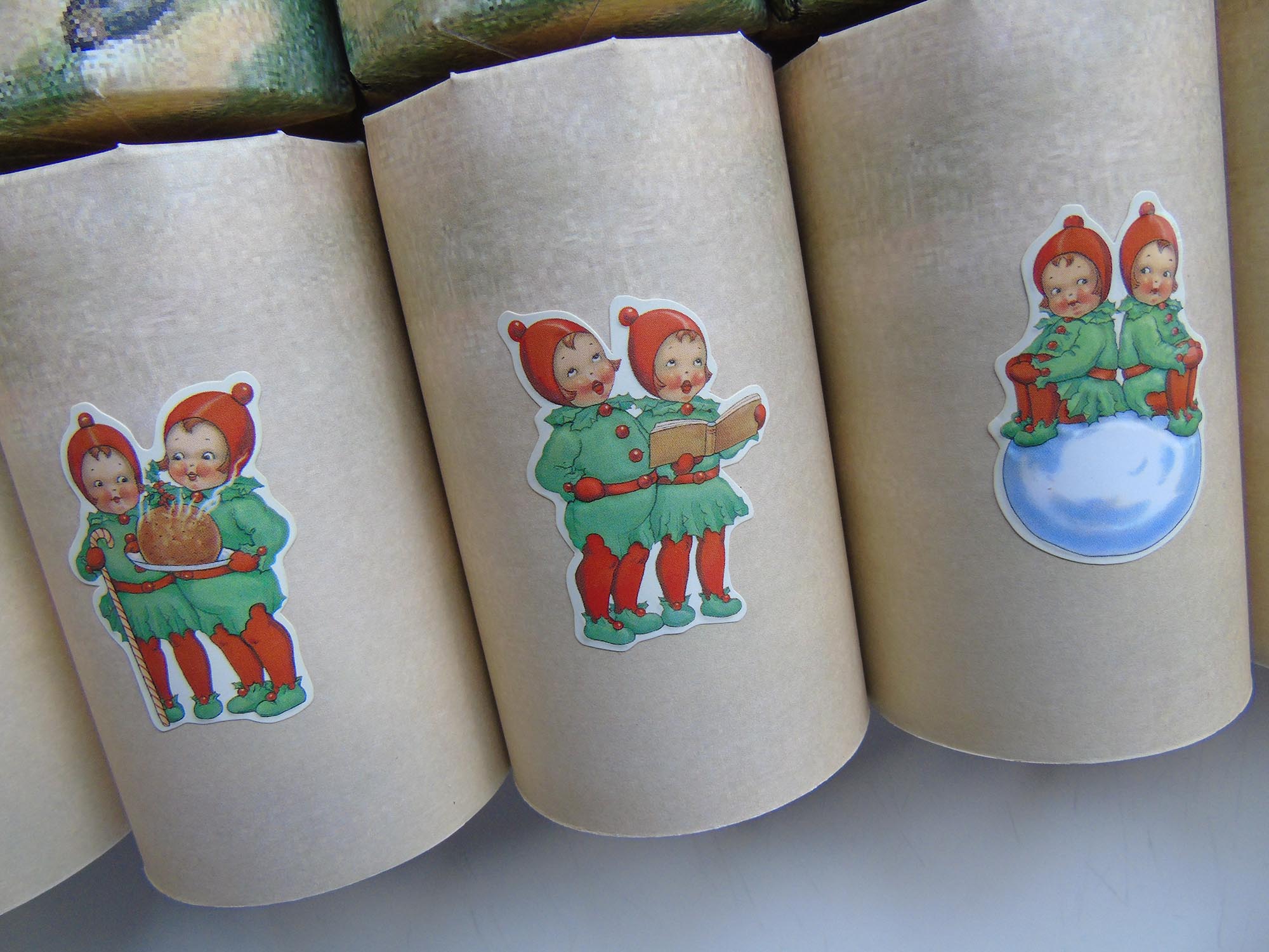 Taken from a wonderful piece of vintage art (c.1930’s) these delightful crackers have a special charm all of their own. To finish them perfectly there is a vintage festive elf sticker (in three designs) on the lower handle.